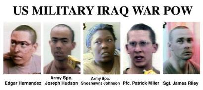 Army Spc. Joseph Hudson of Almagordo, N.M., Army Sgt. James Riley of New Jersey, Army Spc. Shoshawna Johnson of Fort Bliss, Texas, Edgar Hernandez of Texas, rank unknown, and Army Pfc. Patrick Miller of Park City, Kan. are shown in this combination of photos from video seen on Iraqi Televison Sunday, March 23, 2003. These soldiers were shown on Iraqi television after pre-dawn ambush of convoy near An Nasiriyah, southwestern Iraq, March 23. U.S. military lists them as missing, along with seven other soldiers. Iraqi TV also displayed four bodies of what it said were Americans from the attack.