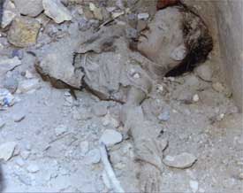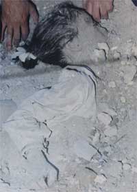 Little girl, aged ten, lies dead in the rubble of her home after a US missile destroyed their home in a residential area of Basra killing six. Her eight year old sister also perished