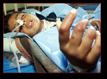 Nine year old, Rana Adnan needs oxygen for a chest laceration and lung contusion with a concussion, head laceration, and shrapnel in her left arm.